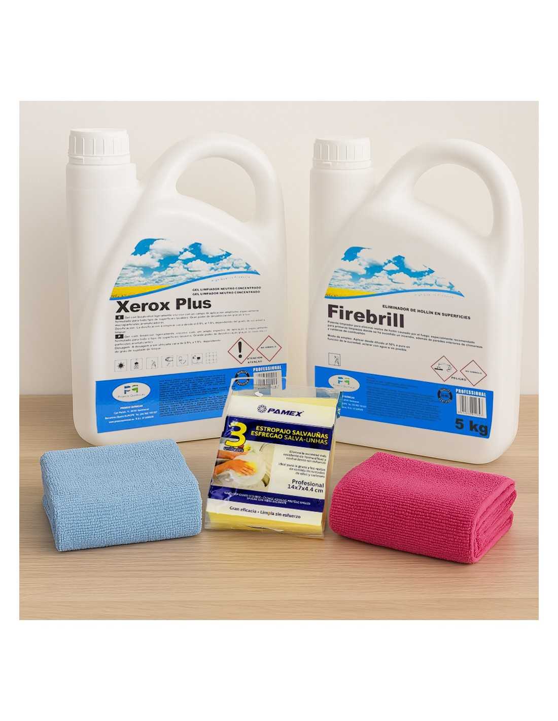 Pack post‑incendio con Firebrill (5 kg), Xerox Plus (5 kg), Air Brisa (1 L) y juego de bayetas y salva‑uñas. Todo lo necesario para limpiar hollín con 10 % de descuento.