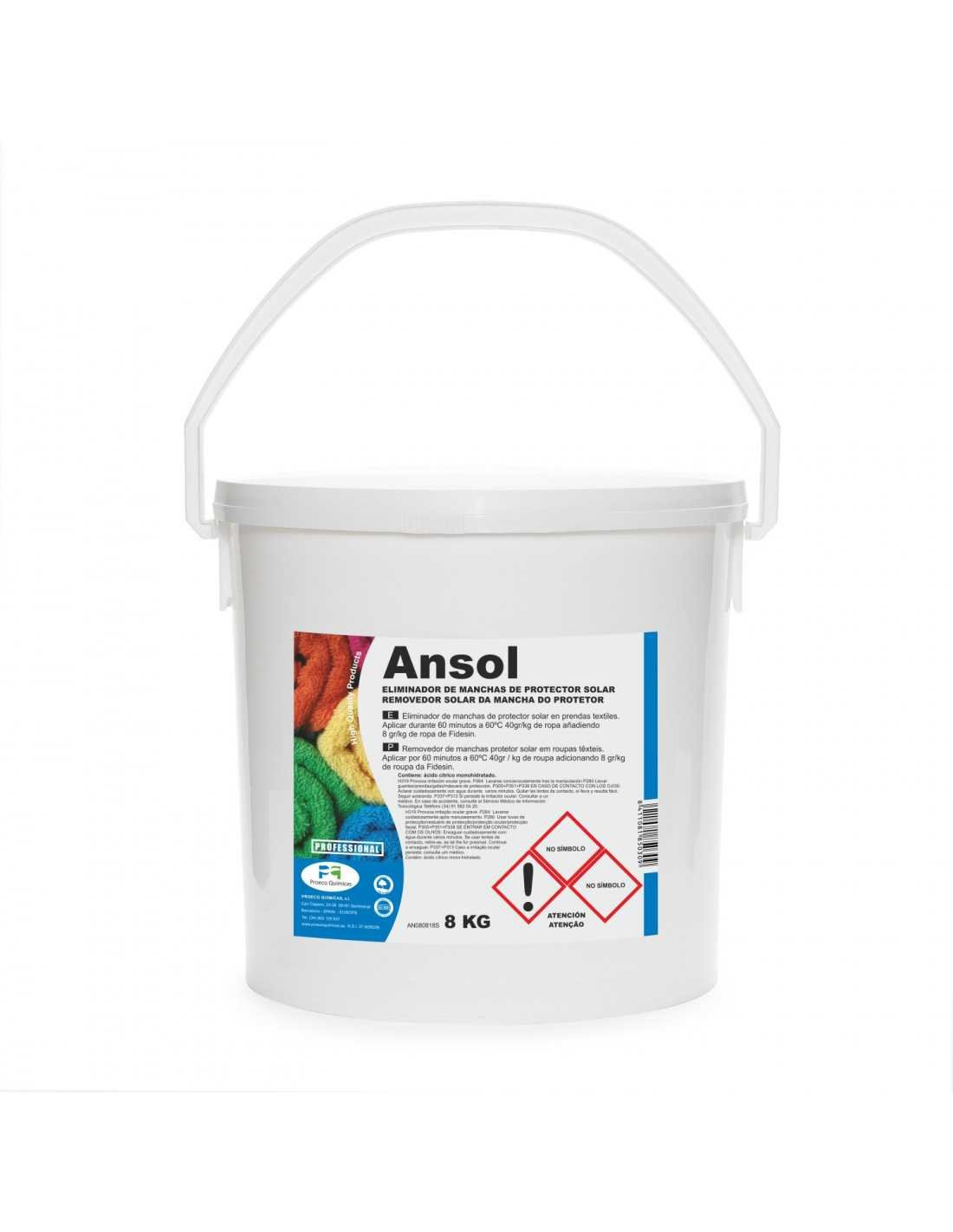 Ansol es un eliminador profesional de manchas de protector solar para textiles, pensado para usarse junto con detergente (Fidesin) y lograr un resultado uniforme.